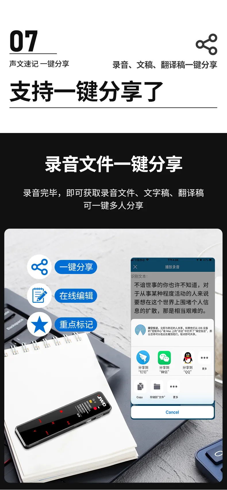 高清原聲音質,AI降噪體驗,拾音速記轉寫,25國同聲轉譯,支持邊充邊錄