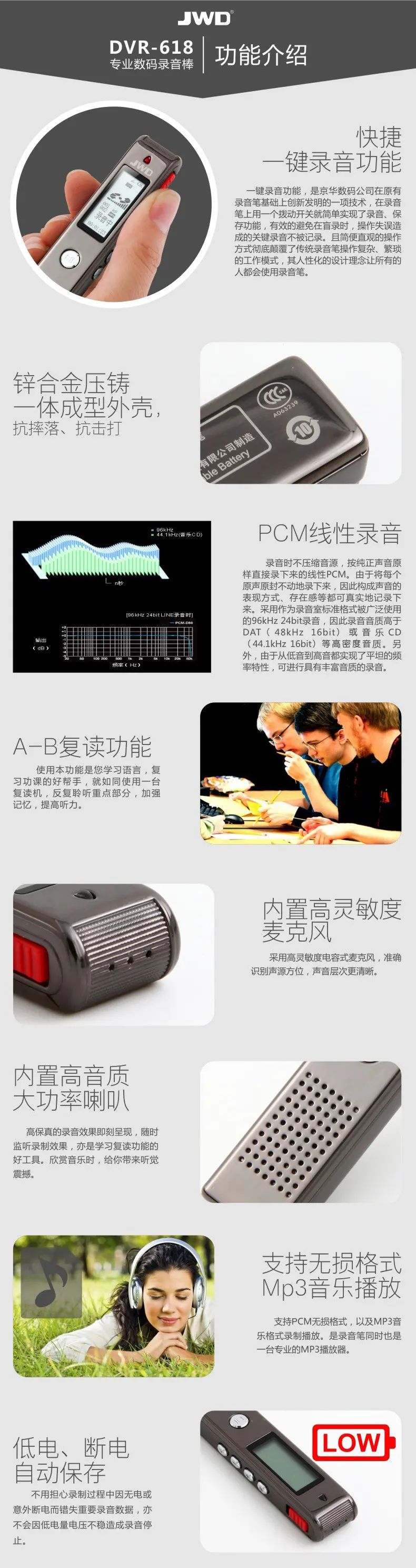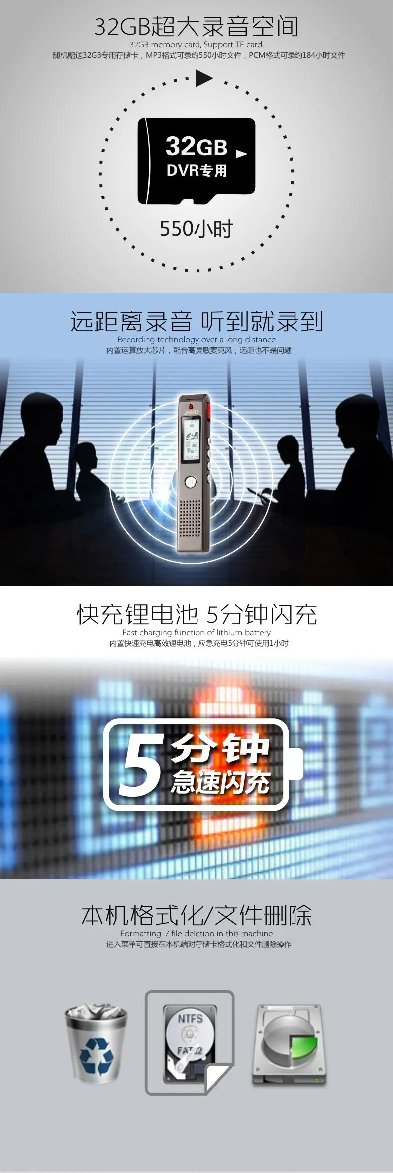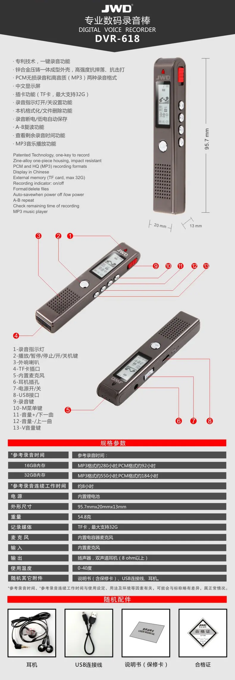 高靈敏麥克風,快速一鍵錄音,A-B復讀,支持存儲卡取換,斷電低電保護,支持存儲卡取換