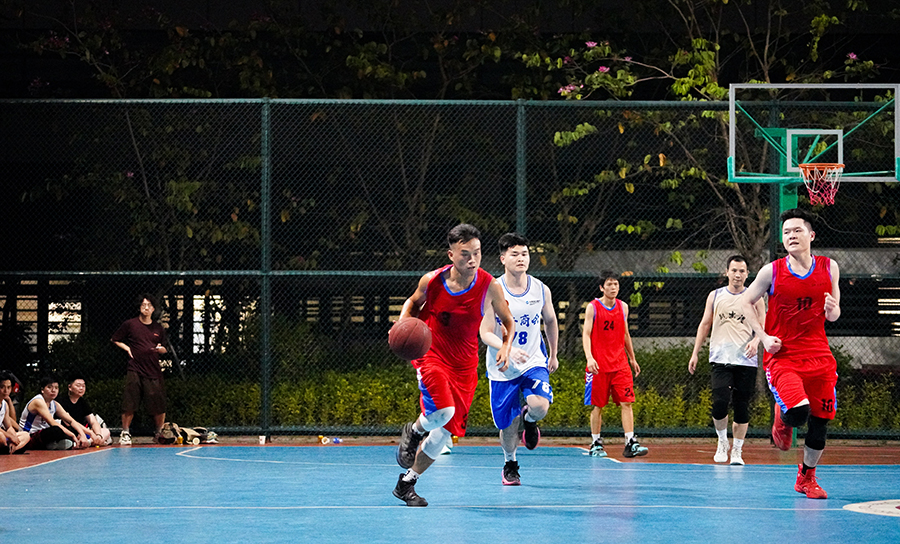 下午6時許,京華公司與電子商會、深圳大學附屬華南醫院的籃球友誼賽正式拉開序幕。隨著裁判員的一聲哨響,雙方球員聞令而動、奮力一躍,為爭奪球權拼盡全力。