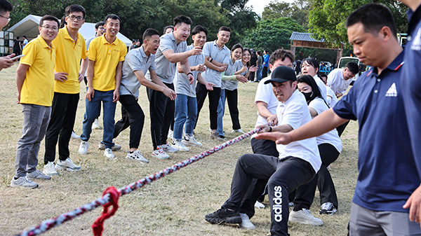 最后壓軸項目,也是最精彩激烈的環(huán)節(jié)——拔河比賽。隊員們在吶喊助威中團結(jié)合作,穩(wěn)定的姿勢傳遞無聲的團結(jié),不到最后一刻決不放棄。經(jīng)過幾輪的循環(huán)晉級賽,京華恐龍抗狼隊成為本項目的一匹黑馬,與往年的常勝冠軍隊——京佳物業(yè)無敵隊一同進入決賽。兩支隊伍斗志昂揚,拔河開始就陷入僵持階段,難分伯仲。最后京佳物業(yè)無敵隊依靠穩(wěn)定的發(fā)揮奪得最終的勝利。